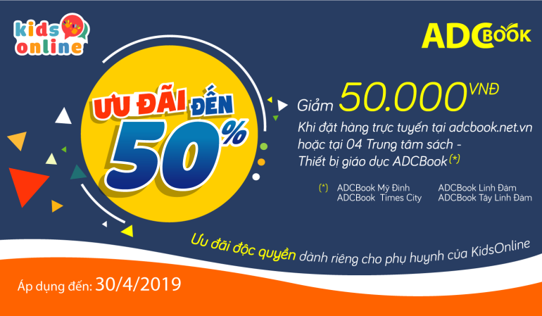 Quà tặng chương trình Tri ân khách hàng – KidsOnline trợ giá mua sách và đồ dùng học tập cho con tại ADCBook, mỗi phụ huynh được nhận 01 mã giảm giá 50.000vnđ khi mua trực tuyến trên http://adcbook.net.vn/ và mua hàng trực tiếp