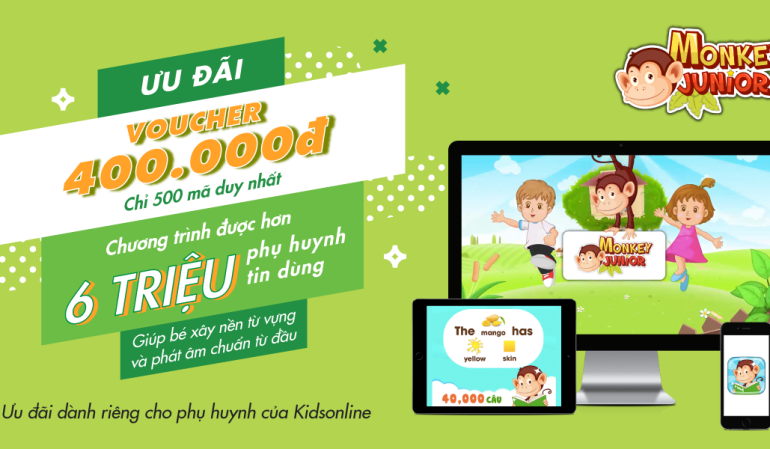 [Ưu đãi độc quyền dành riêng cho khách hàng của KidsOnline] Quà tặng chương trình Tri ân khách hàng –KidsOnline trợ giá mua tài khoản học ngôn ngữ Monkey Junior cho con, mỗi phụ huynh được nhận 01 voucher 499.000vnđ khi