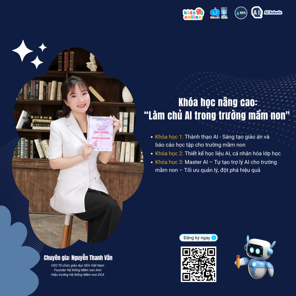 Bộ ba khóa học “Làm chủ AI trong trường mầm non” được thiết kế dành riêng cho môi trường mầm non Việt Nam, giúp thầy cô ứng dụng AI vào giảng dạy và quản lý lớp học thông minh, thuận tiện.