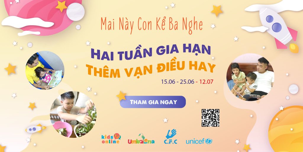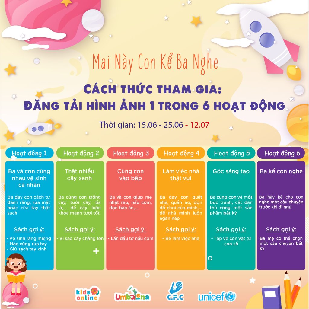 Ba mẹ lựa chọn đăng tải hình ảnh của 1 trong 6 hoạt động mà Ban tổ chức đưa ra, kèm 2 hashtag #mainayconkebanghe #<tên trường bé đang theo học> trong group “Mai này con kể ba nghe”.
