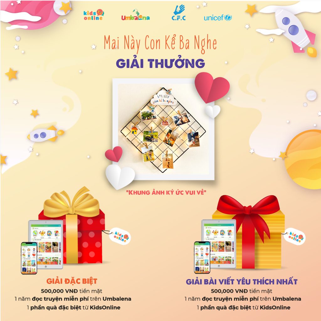 – 01 giải đặc biệt từ BTC dành tặng cho bài dự thi ấn tượng nhất do BTC bình chọn, bao gồm: 500,000 đồng tiền mặt + 1 năm đọc truyện miễn phí trên Umbalena + 1 phần quà đặc biệt từ KidsOnline
