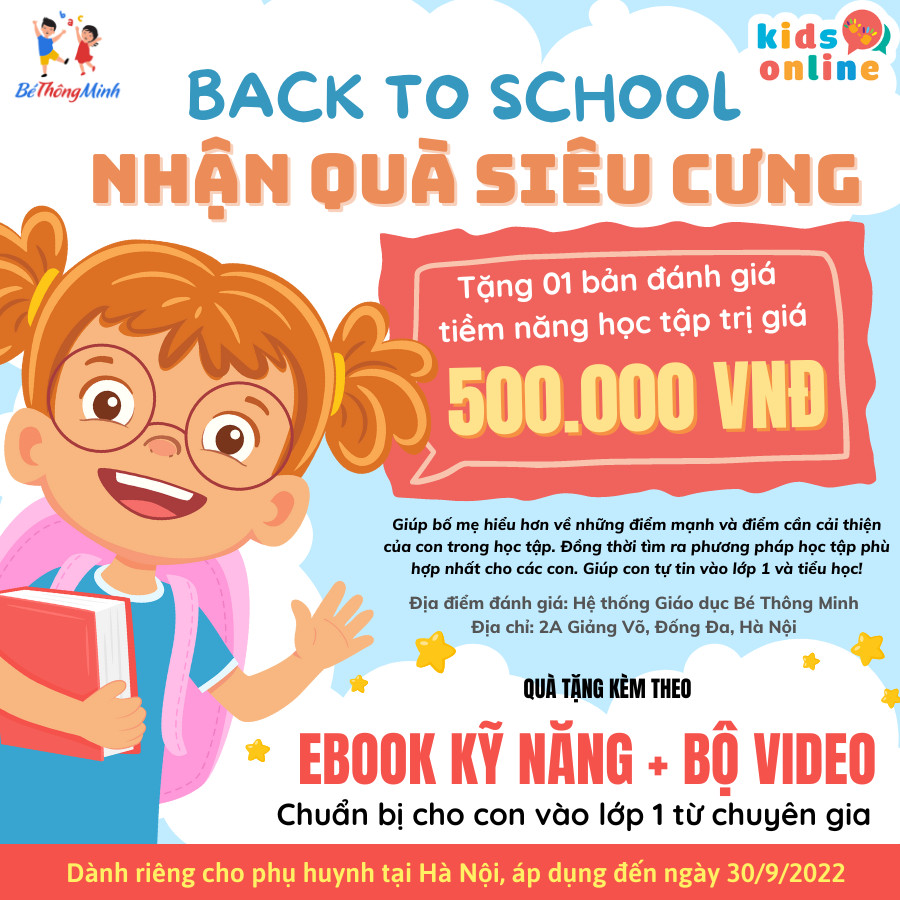 Mùa tựu trường tháng 9 này, KidsOnline cùng Bé Thông Minh dành tặng các bé học sinh tại Hà Nội 1 buổi học trải nghiệm trực tuyến theo chương trình Phát triển Tư duy và Kỹ năng FasTracKids (dành cho trẻ từ 3-9 tuổi) kèm 1 bản đánh giá tiềm năng học tập FasTracKids trị giá 500.000 VNĐ do các chuyên gia nhiều năm kinh nghiệm tại Bé Thông Minh đánh giá. Giúp bố mẹ hiểu hơn về những điểm mạnh, điểm yếu của con trong học tập. Đồng thời tìm ra được phương pháp học tập hiệu quả nhất cho các con.