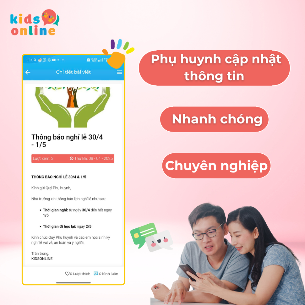 - Chắc chắn không bỏ sót ai: Khi sử dụng KidsOnline, thông báo sẽ được gửi trực tiếp đến điện thoại của phụ huynh, đảm bảo không có ai bị bỏ sót. Mọi thông tin quan trọng như lịch nghỉ, sự kiện của trường đều sẽ được thông báo đầy đủ và chính xác.