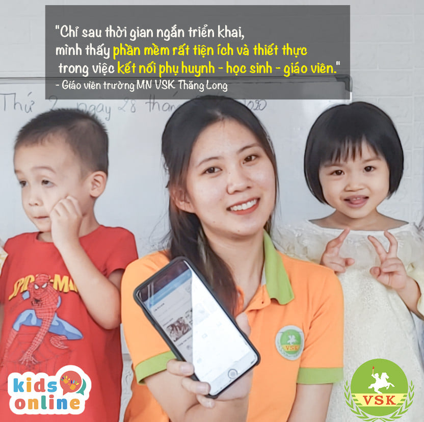 – “Sau một thời gian triển khải phần mềm KidsOnline tại nhà trường, mình cảm thấy phần mềm rất tiện ích, thiết thực giúp nhà trường tăng cường kết nối phụ huynh, học sinh và giáo viên. KidsOnline giống như một cuốn sổ liên lạc điện tử, cho phép giáo viên điểm danh, cập nhật thông tin học tập, sức khỏe, chế độ ăn ngủ của từng bé đến phụ huynh một cách nhanh nhất, giúp giáo viên giảm tải khá nhiều công việc, không bỏ lỡ bất cứ thông báo nào từ nhà trường.