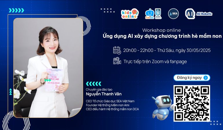 Vào thứ Sáu, ngày 30/5/2025, KidsOnline và KidsEdu, cùng sự phối hợp của Tổ chức Giáo dục SEA Việt Nam và Ai Robotic, đã tổ chức thành công workshop online miễn phí với chủ đề “Ứng dụng AI trong thiết kế chương trình hè mầm non”. Chương trình đã thu hút hơn 300 thầy cô giáo mầm non trên khắp cả nước tham gia. Đây là cơ hội tuyệt vời giúp các giáo viên nâng cao kỹ năng sử dụng AI để xây dựng những chương trình hè chất lượng cho trẻ mầm non.